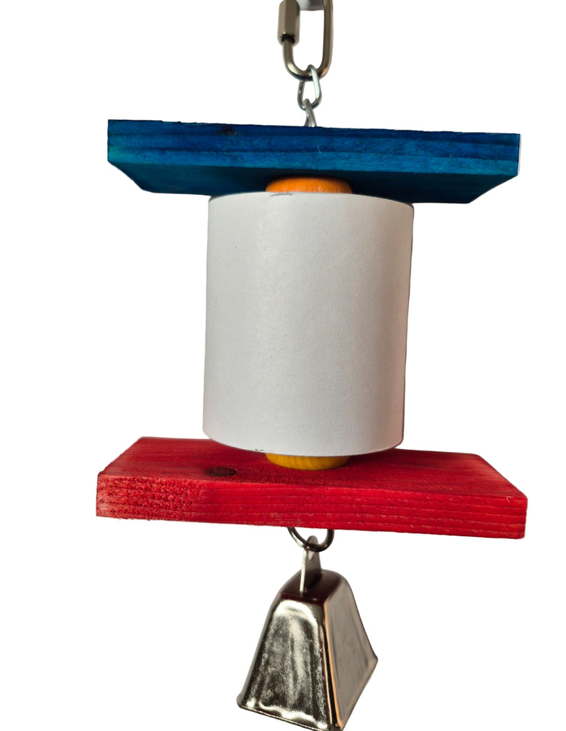 A 3" paper roll with 1/2"H x 2"W x 5"L wood blocks and 2 x wood discs strung on a chain with a small cow bell. Quick link included for hanging.
