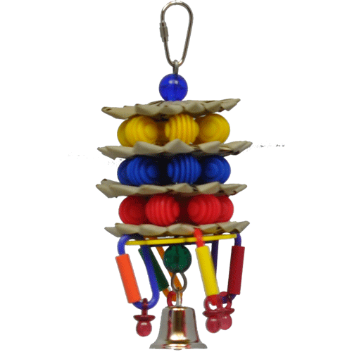 This toy includes various avian safe materials such as 3 palm stars, 3 plastic assorted rainbow colored interlocking stars, various plastic toys and a ringing bell. This toy also has a small pear link and can easily and securely attach to any cage. The groves in the palm and plastic stars allow for you to hide your pets treats.